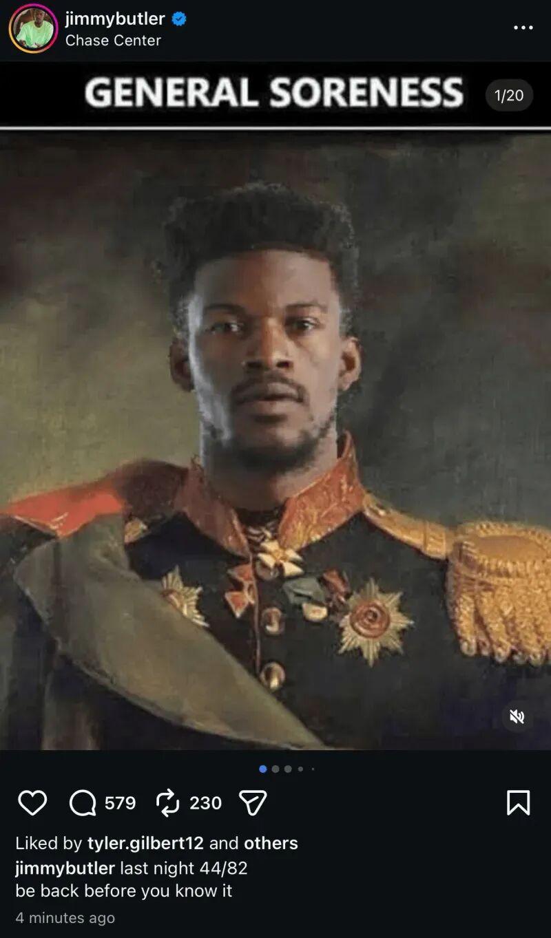 巴特勒赛季报销后,心情竟然还不错 在社媒上晒出一张久远的梗图:酸痛将军 该梗源自于森林狼时期,巴特勒向球队请求交易后长时间以全身酸痛(General Soreness)理由缺席,森林狼球迷则P图称呼其为酸痛将军(General Soreness的另一层释义)。点击下方名片关注:贵圈真乱...